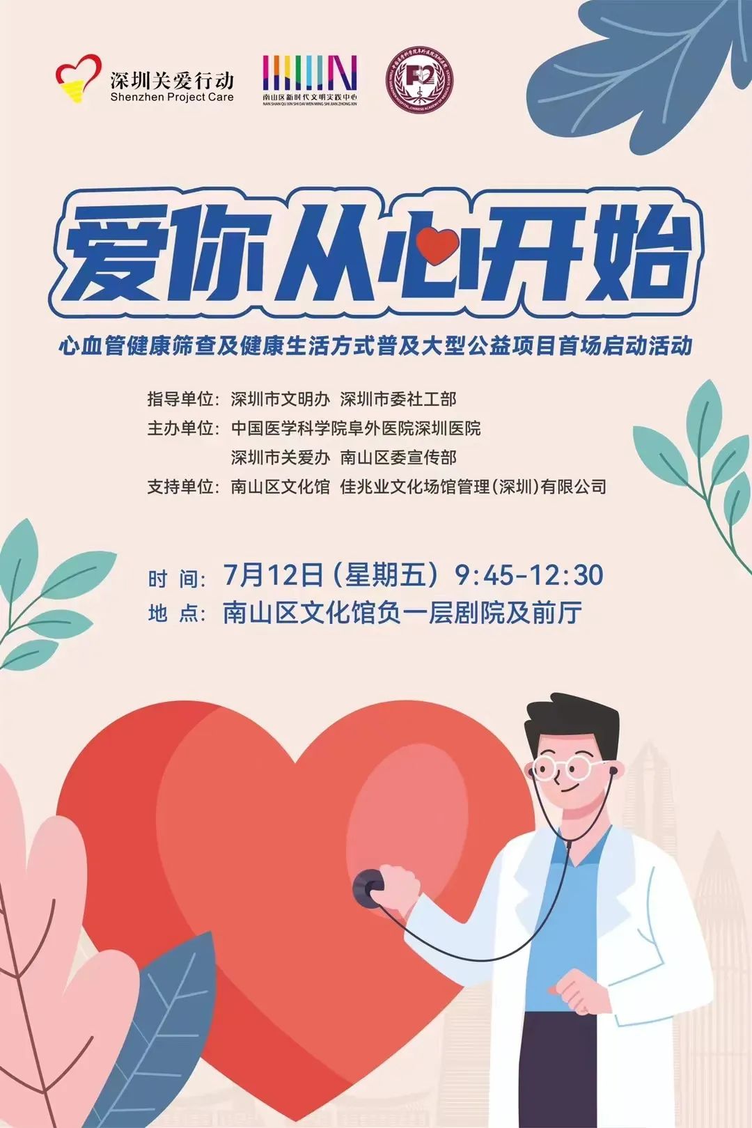 活動簡介:為貫徹落實黨中央關于加快推進“健康中國2030”建設的重大決策部署,踐行“以基層為重點、以預防為主”的工作方針,加大對包括新業態勞動者、低收入群體等社會困難群體,以及各級“道德模范”等重點人群的關愛力度,深圳市關愛行動組委會辦公室聯合中國醫學科學院阜外醫院深圳醫院,依托國家心血管病中心、國家區域醫療中心“雙中心”平臺,合力推進深圳市心血管病防治中心、深圳市醫防融合項目,共同開展“愛你從心開始”心血管健康篩查大型公益行動,面向深圳全市各區(新區)新就業群體、低收入群體和重點領域人群,推出12000個心血管健康篩查服務名額及相關配套服務,旨在推動心血管慢病防治體系建設,促進智慧化心血管慢病健康管理,完成優質醫療資源深度下沉入基層社區。