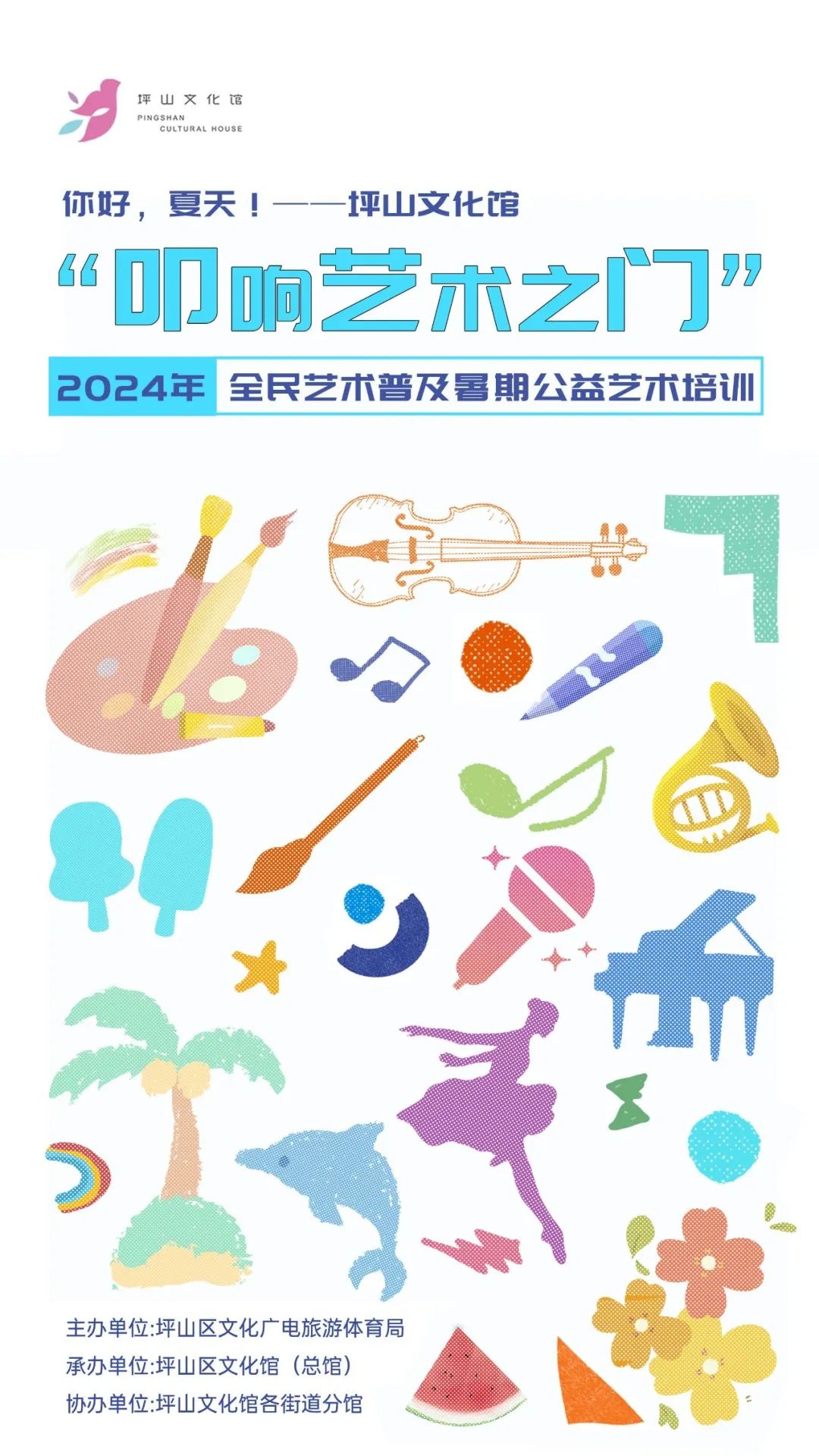 活動簡介:坪山文化館傾力打造的“叩響藝術之門”公益培訓品牌,秉承“創新·服務”宗旨,結合坪山文化特色與市民需求,為各年齡層市民提供多樣化的藝術課程,包括少兒舞蹈、音樂、美術等,以及成人手工、健身等,歡迎廣大市民朋友踴躍報名!