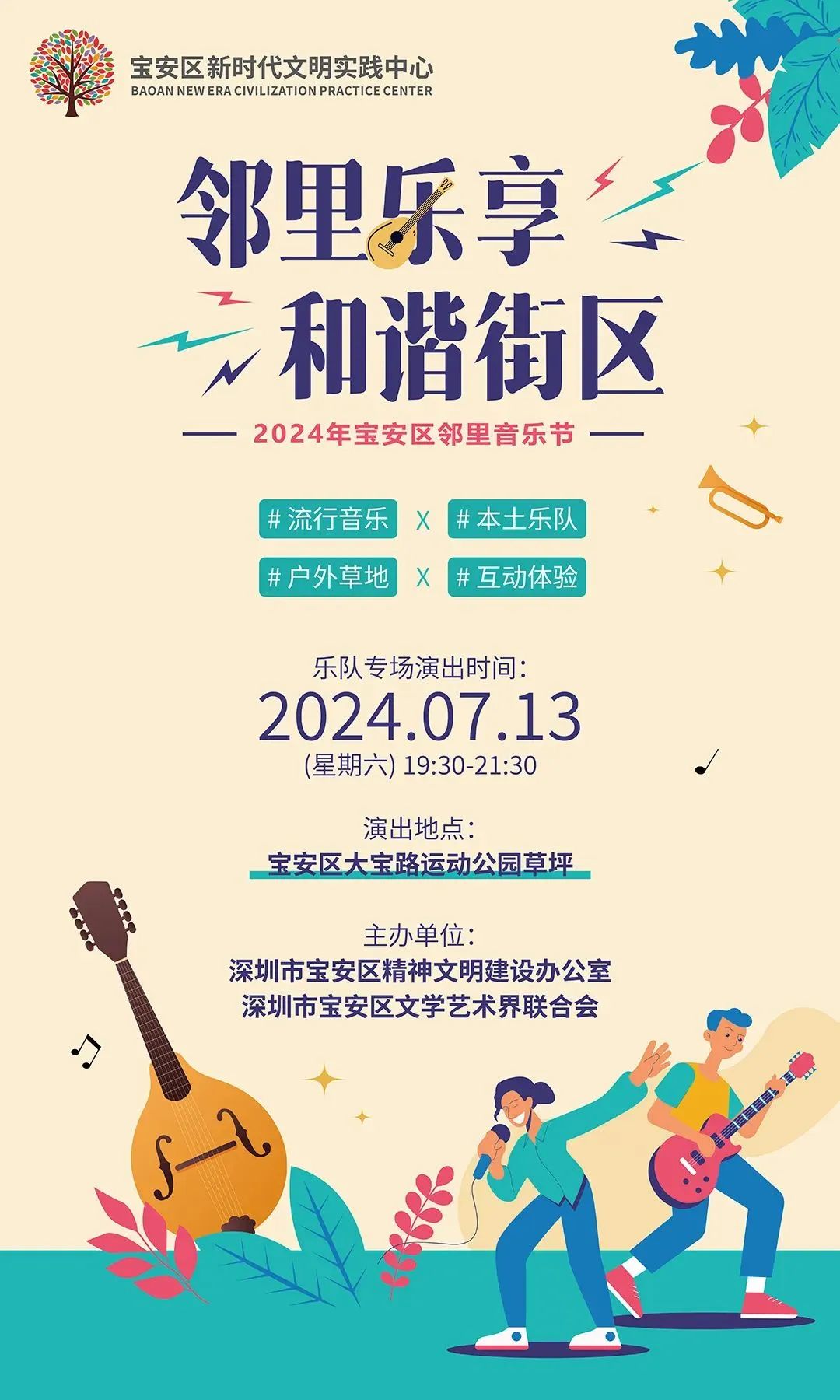 活動簡介:7月13日(本周六)“鄰里樂享·和諧街區”2024年寶安區鄰里音樂節即將熱情開唱。作為寶安區2024年“我實踐 我文明”新時代文明實踐精品活動季的重點活動之一,鄰里音樂節將讓熱愛生活、熱愛音樂的你,在夏天持續釋放快樂因子,共同感受文明寶安的美好風采。