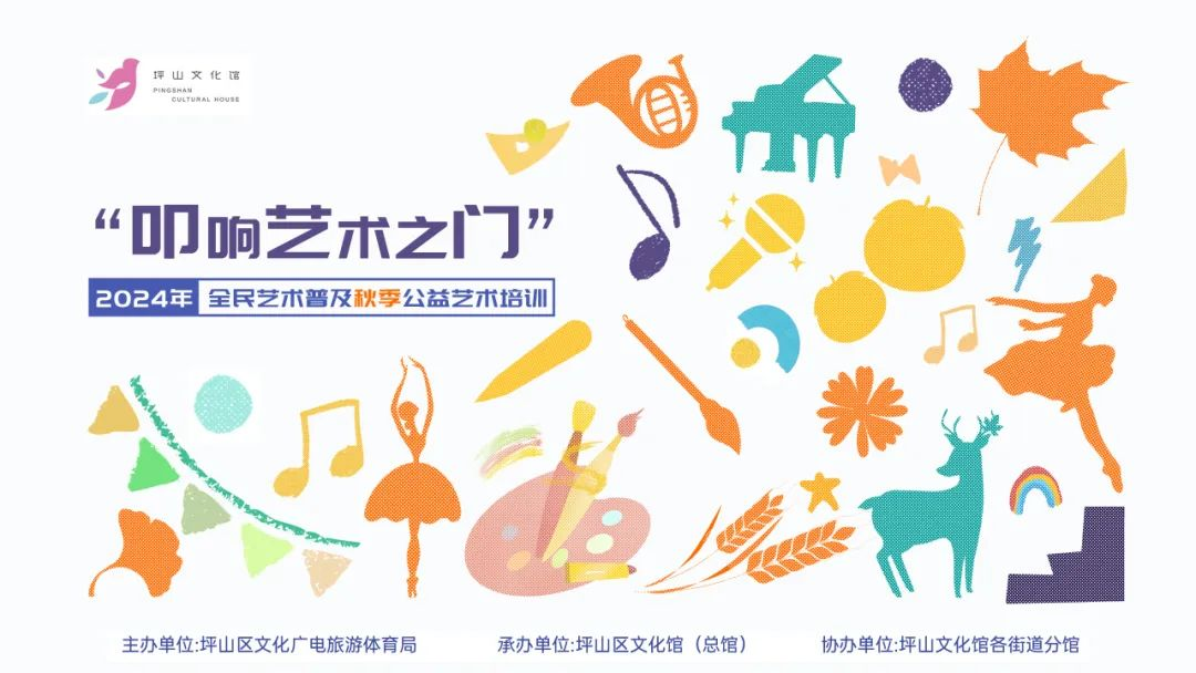 活動簡介:坪山文化館全民藝術普及“叩響藝術之門”公益培訓是坪山文化館的常設文化活動品牌之一,深受廣大市民朋友們的喜愛。坪山文化館即將推出“叩響藝術之門”公益培訓2024年秋季課程。本期秋季課程面向坪山區的文化愛好者,根據他們的年齡、興趣愛好,結合坪山本地的文化特色,本期課程將在坪山文化館開展。