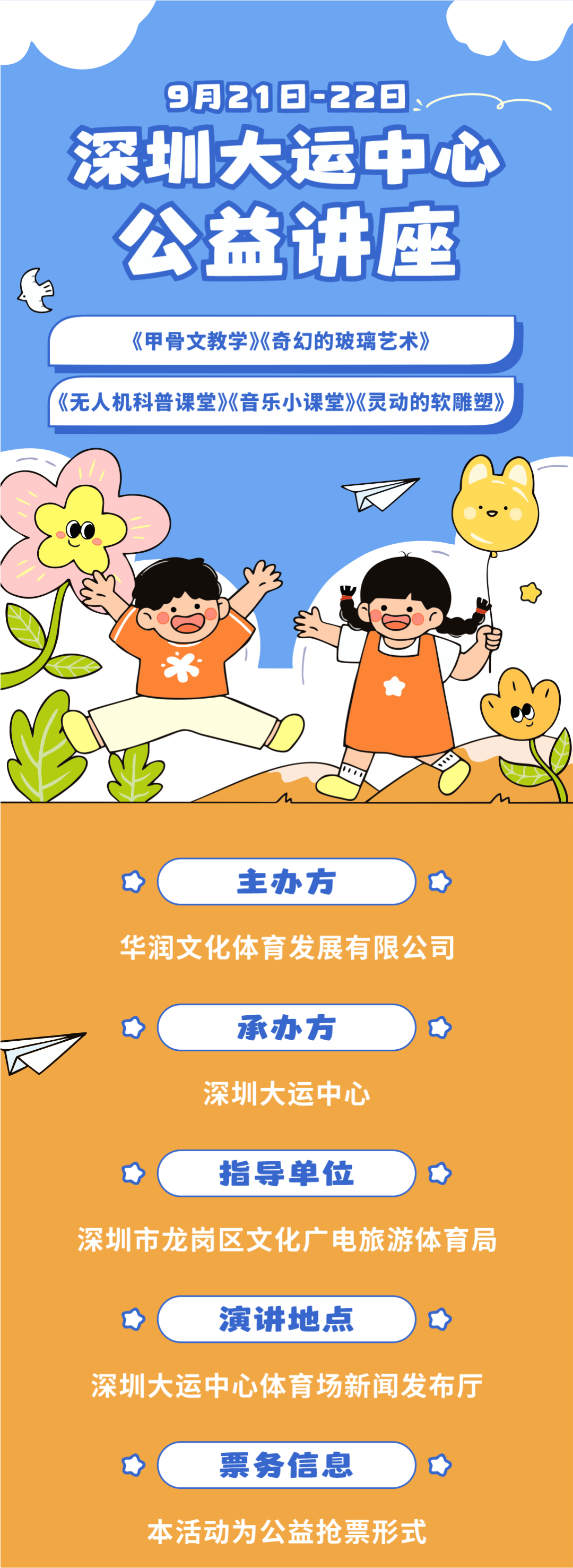活動簡介:深圳大運中心公益講座將于9月21-22日舉辦,講座內容包括《甲骨文教學》《奇幻的玻璃藝術》《無人機科普課堂》《音樂小課堂》及《靈動的軟雕塑》等主題。通過趣味互動和現場體驗,讓孩子們感受傳統文化的魅力,了解現代科技的進展,提升藝術修養,探索文藝科技的多元魅力。
