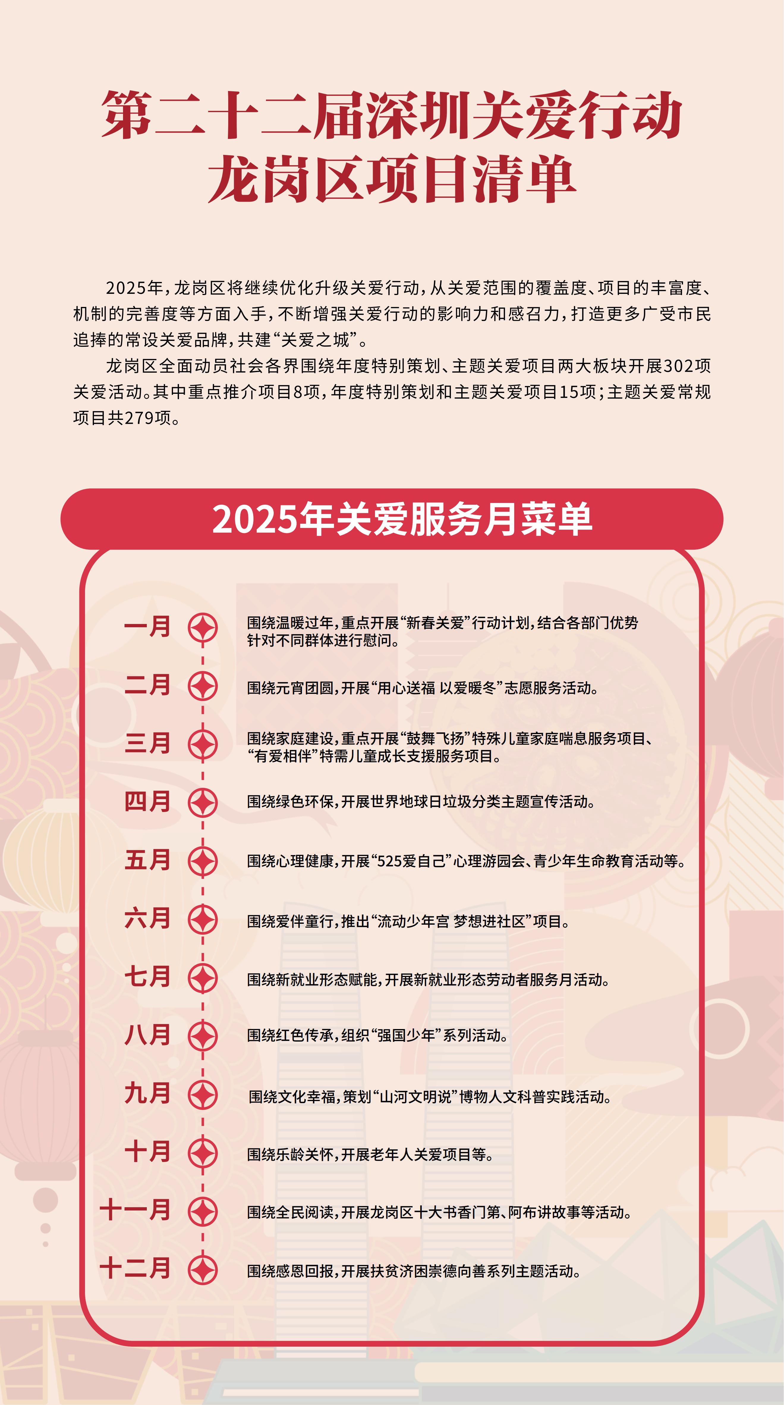 據(jù)了解,“關(guān)愛+”模式已成為龍崗區(qū)聚焦領(lǐng)域服務(wù),精準(zhǔn)關(guān)愛“惠民心”的重要舉措之一。龍崗區(qū)各部門及社會(huì)各界精準(zhǔn)策劃、集中力量推出了一系列契合市民需求和務(wù)實(shí)有效的關(guān)愛項(xiàng)目,2024年共計(jì)開展了180項(xiàng)關(guān)愛活動(dòng),其中包括精心組織的7項(xiàng)關(guān)愛行動(dòng)示范項(xiàng)目以及173項(xiàng)重點(diǎn)和常規(guī)項(xiàng)目,涌現(xiàn)出“新春大盆菜 溫暖送到家”、“山河文明說”、“文明100+”文明實(shí)踐主題日等一系列品牌活動(dòng),有力推動(dòng)了人民群眾在物質(zhì)和精神上的共同富裕。