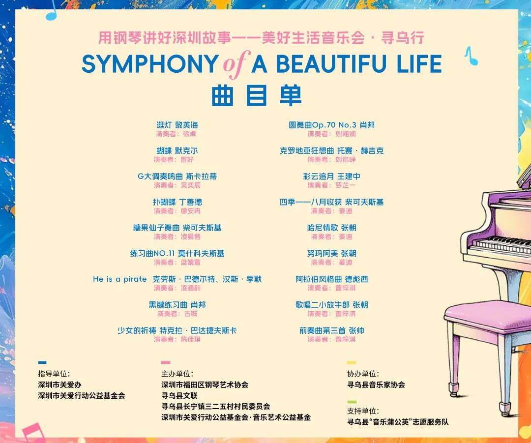 關愛之城,是深圳這座移民之城傲人的精神坐標,深圳市福田區鋼琴藝術協會聯合深圳市關愛行動公益基金會·音樂藝術公益基會,將來尋烏縣,推出“用鋼琴講好深圳故事·美好生活音樂會”系列公益活動。通過打造“音樂+公益”的創新公益場景,以鋼琴作為載體,聯動深圳鋼琴藝術家,聯合尋烏縣音樂家協會和“音樂蒲公英"志愿服務隊,在尋烏開展公益助學、交流展演會,助力尋烏縣鋼琴文化的普及和藝術素質的提升。
