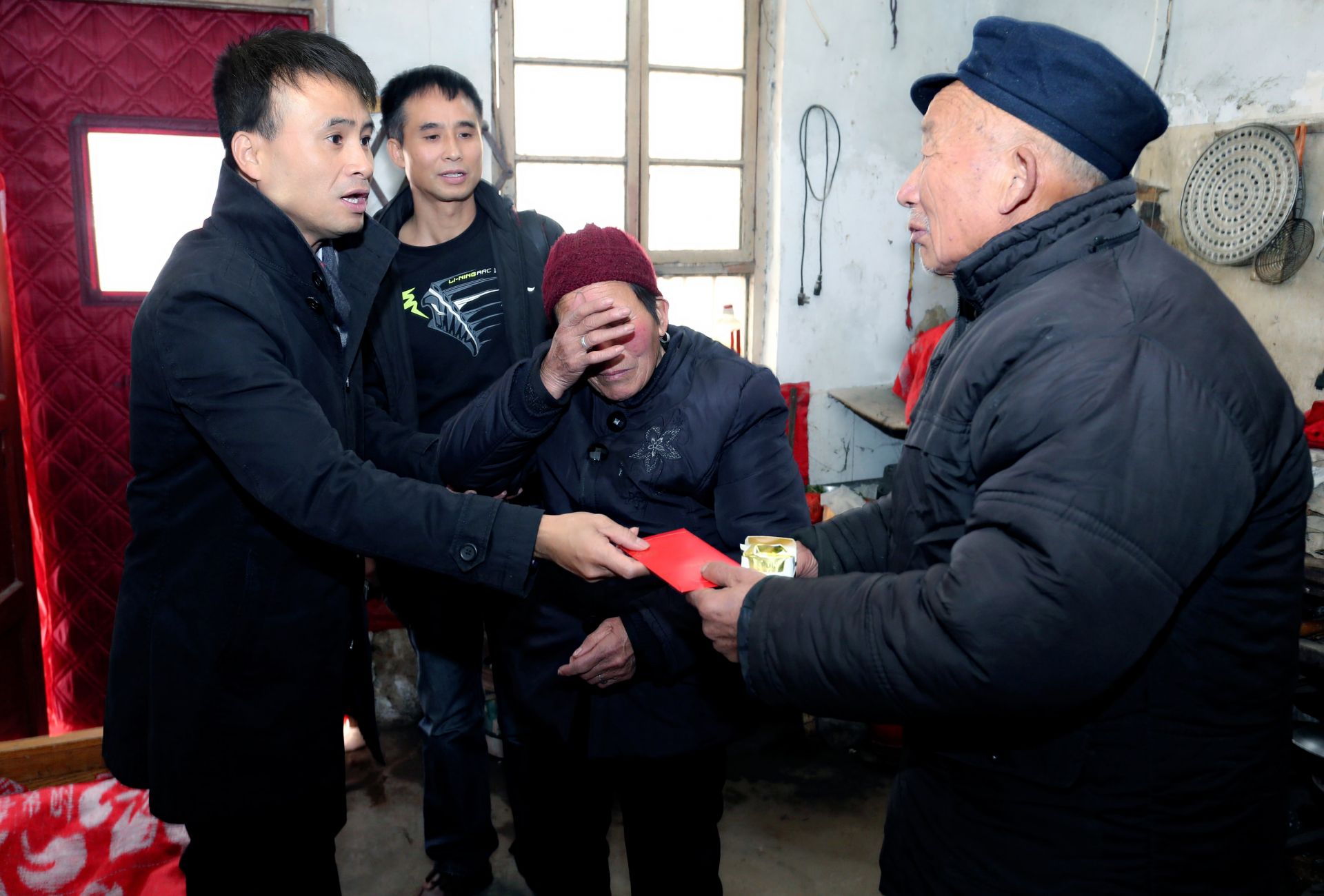 張國防(左一)看望李海欣父母